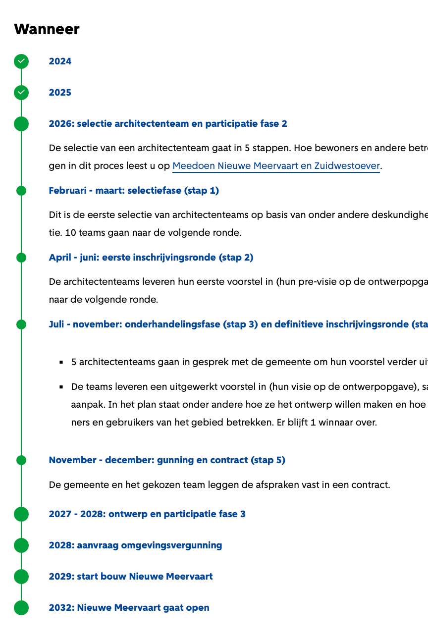 Tot en met 13 februari 2026 konden architectenteams zich inschrijven voor de competitie om een ontwerpvisie te maken voor de Nieuwe Meervaart en de zuidwestoever. Eind februari zijn de selectiecommissie én adviesgroep van bewoners en betrokkenen gestart met de eerste stap in het selectieproces.
