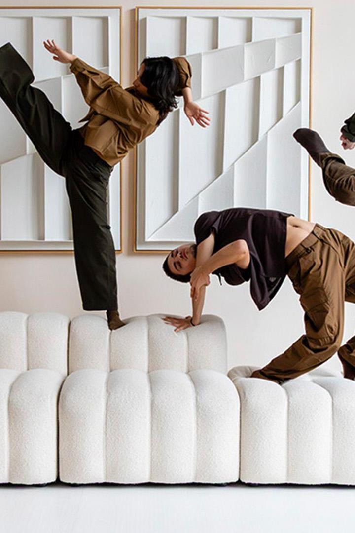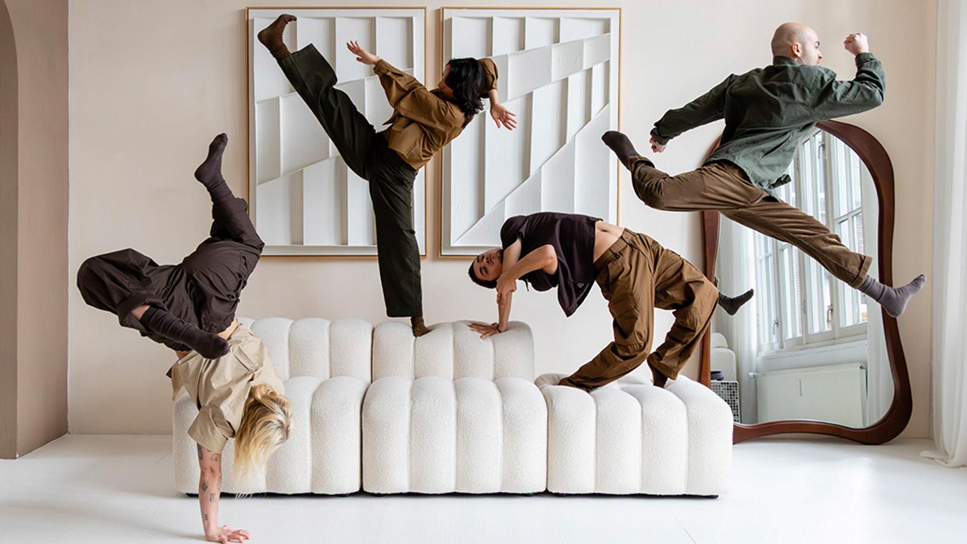 Als wij in de zaal zitten is de sfeer meteen anders dan buiten. De dansers op het podium staren ons aan. Ze zitten in een huiskamer met banken en lampen. Hun blikken zuigen ons een andere dimensie in. Er borrelt een onrustig gevoel in mij op. Niet alleen in mij. Het kind achter mij kan zijn benen niet stil houden. De vrouw naast mij moet een paar keer van jas wisselen. Langzamerhand verdwijnt het achtergrondruis en begint het schouwspel.