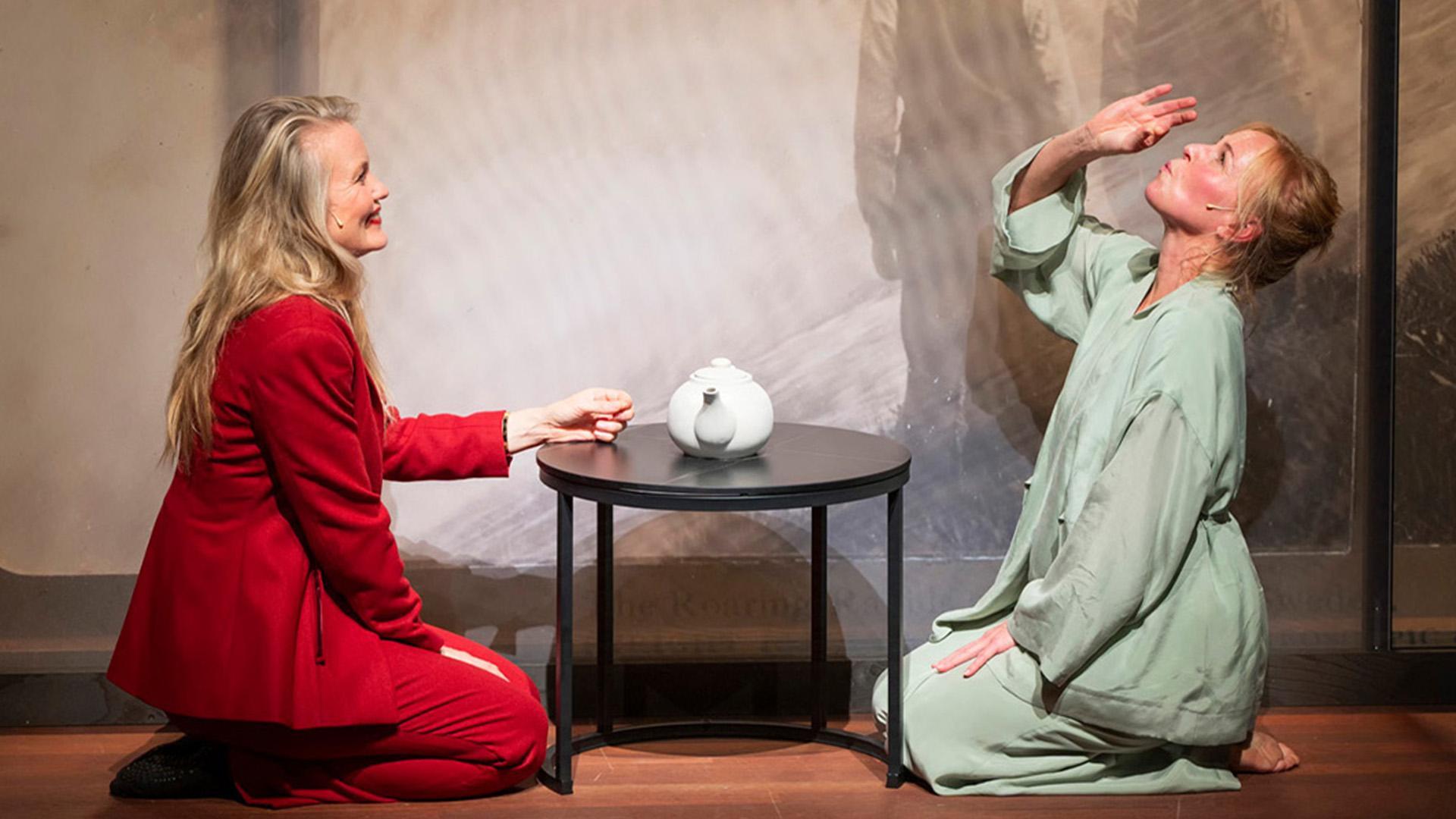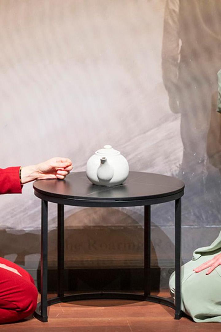 Bij aankomst in de zaal is het podium nog donker. Onder begeleiding van een rustgevend muziekje zoekt iedereen zijn plekje op. Als iedereen eenmaal zit, springt er een spotje aan. Het decor doemt op: een scherm met daarop een schilderij, een bankje en twee stoelen wordt zichtbaar. Het rustgevende muziekje van zojuist wordt vervangen door een luide en elektronische beat. Op een van de stoelen zit een blonde vrouw. Zij kijkt bedenkelijk voor haar uit en tikt driftig op haar stoel. Dit lijkt zij compleet in ritme te doen met de muziek. Enkele seconden later komt haar tegenspeelster het podium op.
