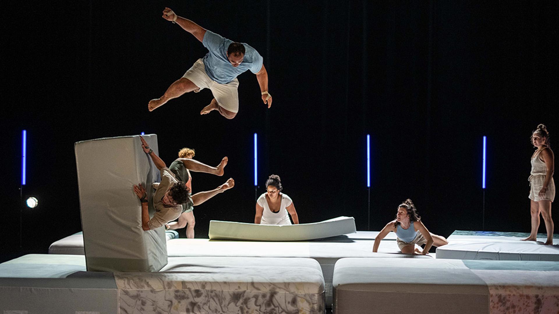 In de voorstelling 'MAT' zien we zeven acrobaten en een heleboel supergrote dikke kussens. Je hoort muziek. Soms wat indringend bombastisch. Dan weer wat lieflijker. Licht speelt zijn rol in het geheel. Het is geen circus! Het is een levensles…